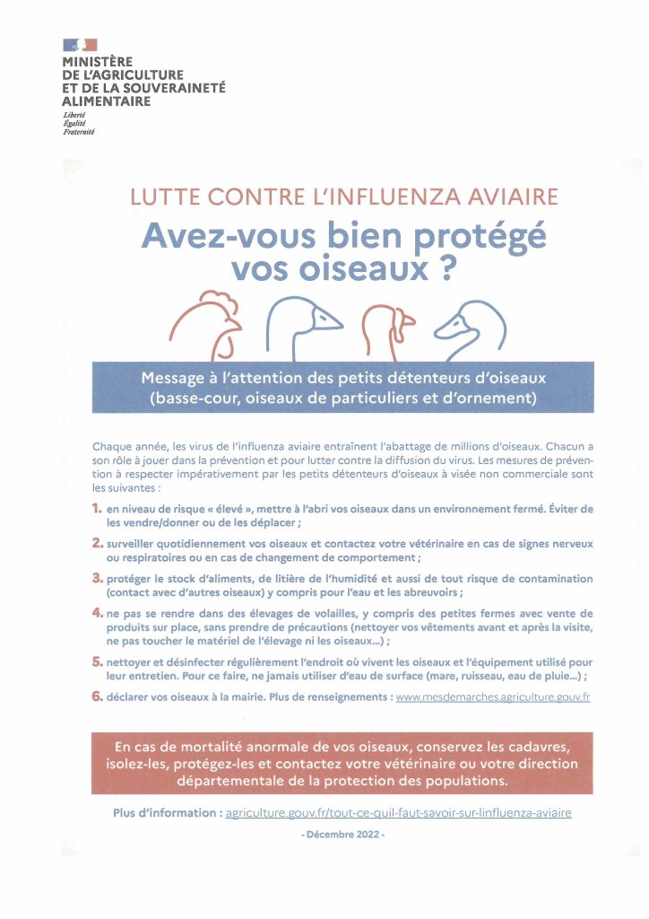 Lutte contre l’influenza aviaire hautement pathogène (IAHP) Mesdames, Messieurs Plusieurs foyers d’IAHP ont été détectés sur le territoire national. L’arrêté…