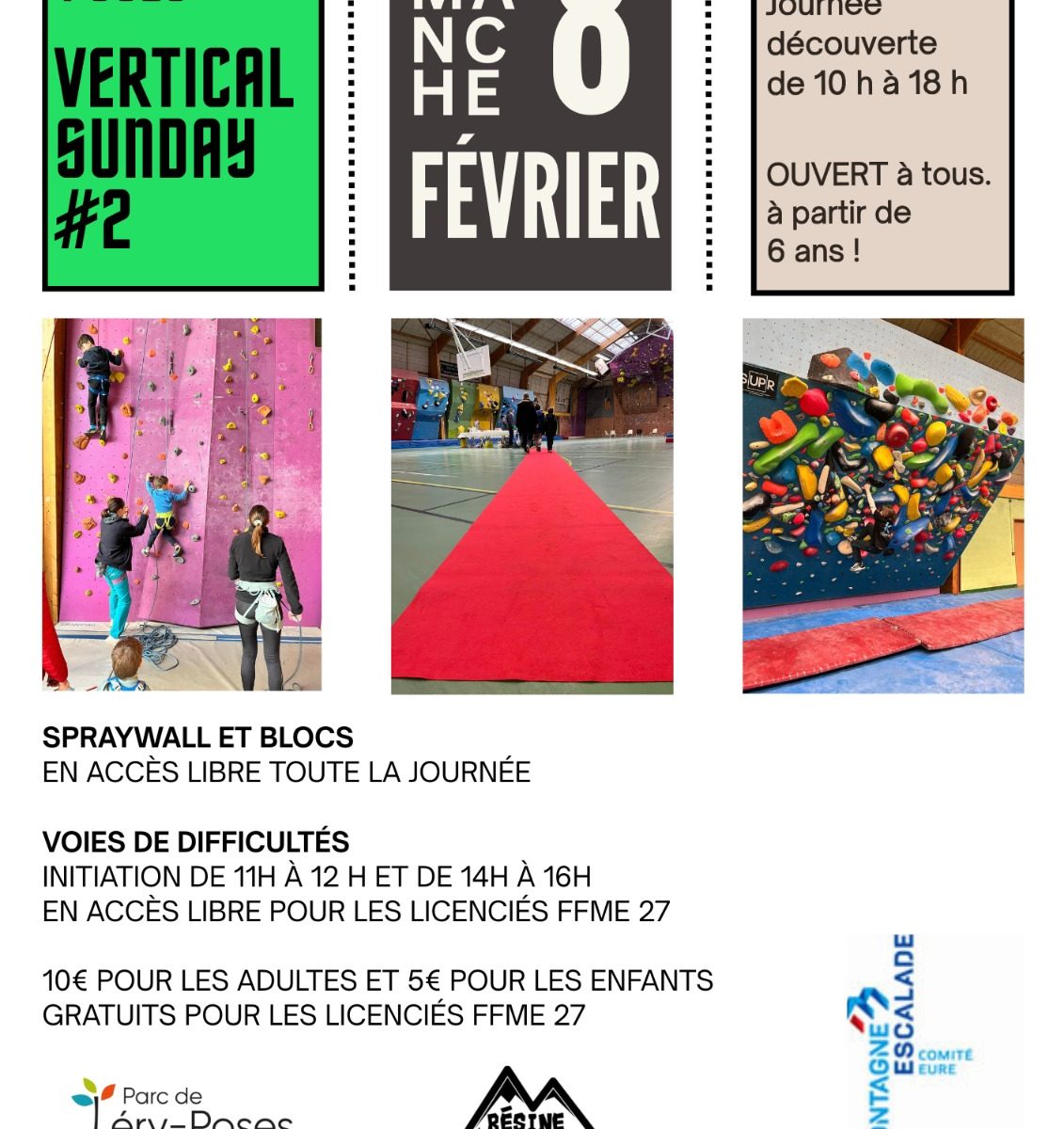 – Ouvert à tous à partir de 6 ans. Ouvert de 10h à 18h. Les débutants seront accueillis de 11h00 à 12h00 et de 14h00 à 16h00 pour faire de la voie. L’espace blocs et le spraywall seront en accès libre.